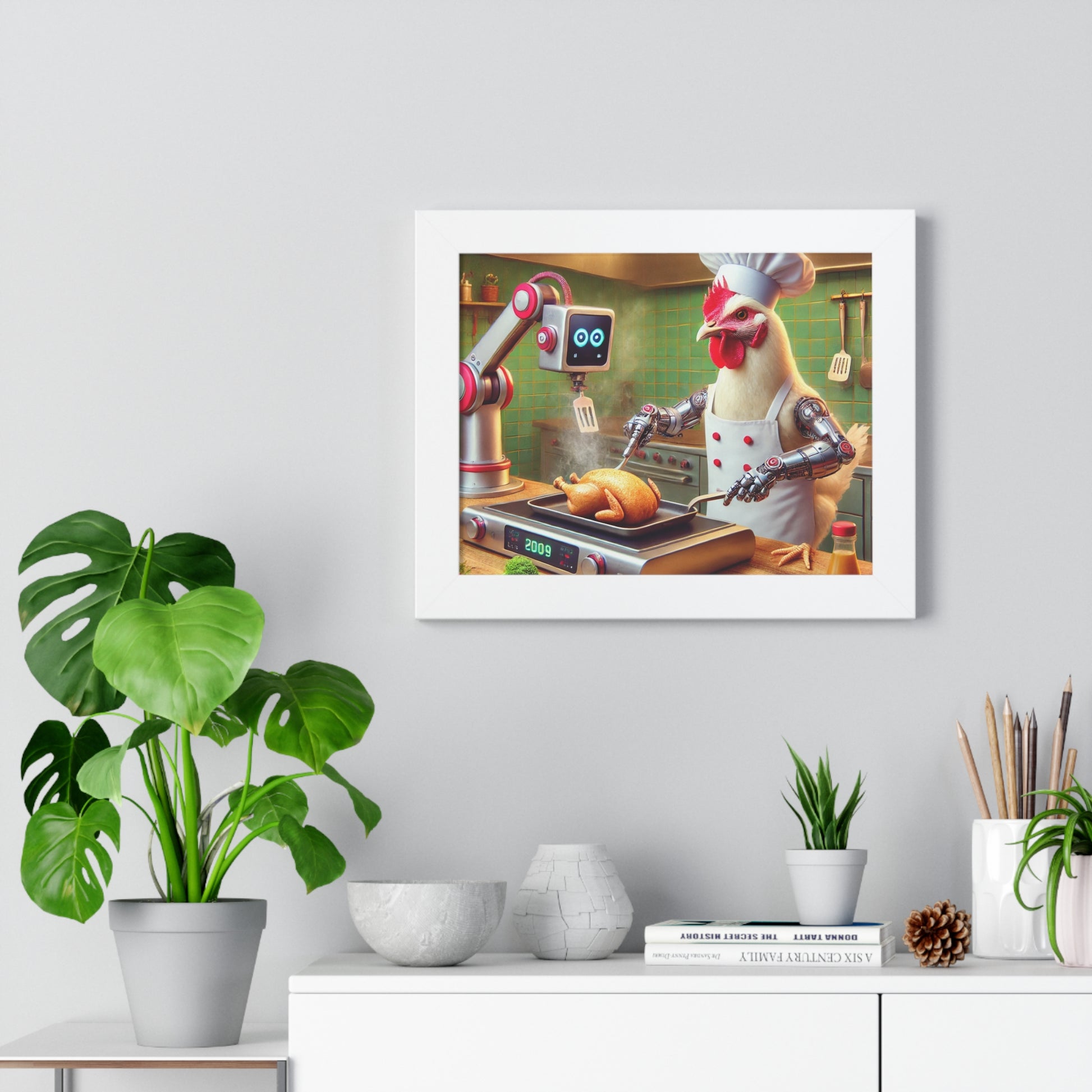 Transform your living space with this stunning framed horizontal poster! This vibrant piece features a whimsical, robotic chicken chef at work, bringing a playful and futuristic vibe to any room. Perfect for kitchens, dining areas, or playful decor themes, it adds a touch of humor and personality. Ideal for foodies, chefs, or anyone who enjoys a quirky decor twist, this poster is a fantastic gift for housewarmings, birthdays, or special occasions. Celebrate creativity and whimsy during holidays and observances such as Christmas or Thanksgiving when gathering with family and friends. Let your home reflect your unique style with art that sparks joy and conversation!